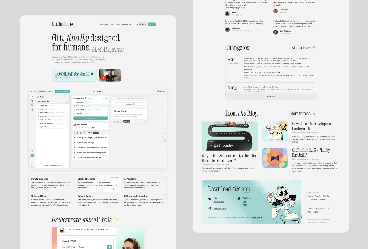 GitButler's primary site uses a light color scheme, with a background of #F3F2F1.