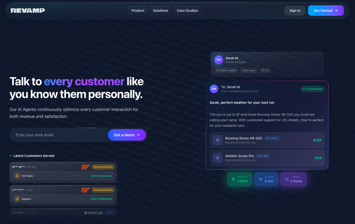 This profile was extracted from https://www.getrevamp.ai using the Firecrawl branding extraction API, which inspects the live page's CSS, fonts, color tokens, and component styles. It is not affiliated with or endorsed by Revamp.